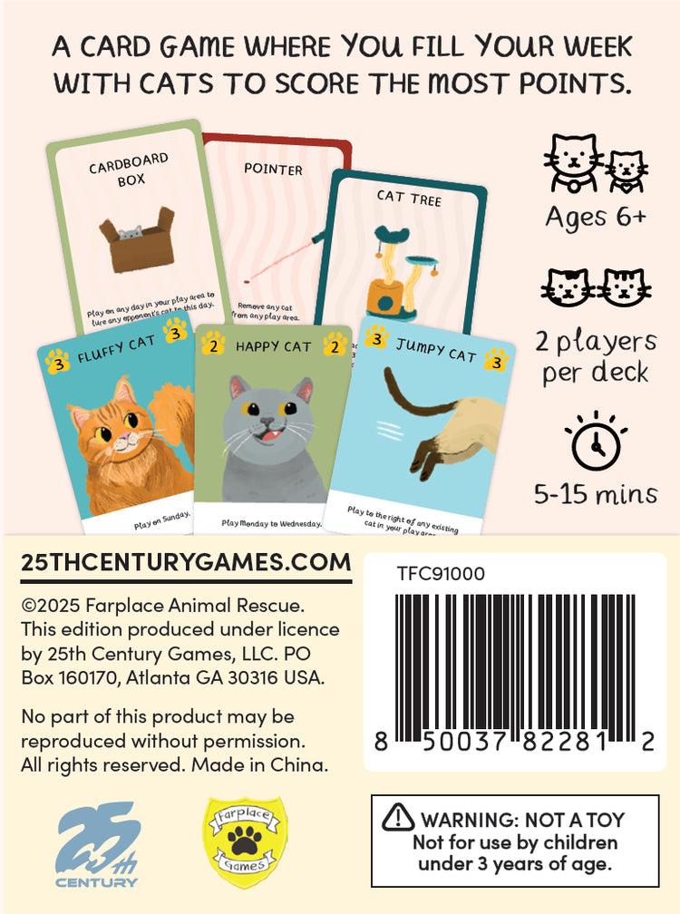 Fill your week of cats, scoring the most points in the process. Each cat has unique rules of play, some cancel scores, some swap cats, other special cards affect game play like the cat tree enabling multiple cats to score the same day and the cardboard box that steals a cat to your week.
