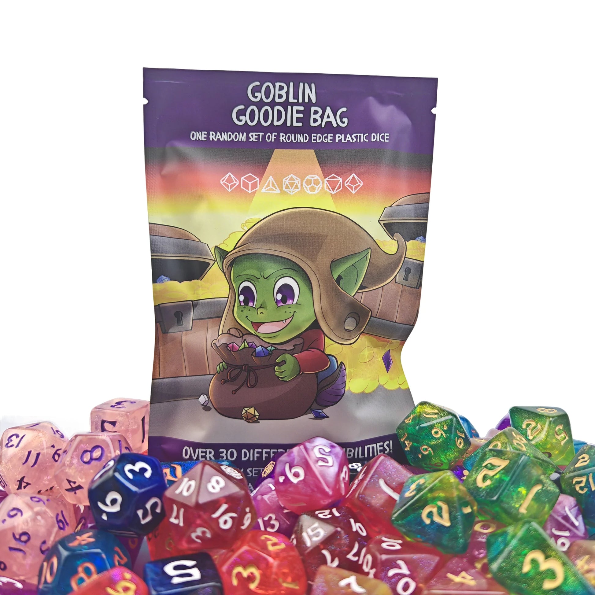 This mystery bag contains one random set of rounded-edge plastic dice with over 30 different possibilities, and every set comes with an extra D20!