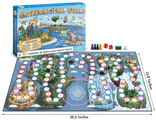Mathemagical World is an Addition & Subtraction Math Board Game for Kids ages 5+. It is a fun way to practice math, at home or at school and takes just seconds to master and can be played from minutes to hours! Learn math concepts of addition, subtraction, doubling and halfing all while you practice critical thinking. Loved by kids, approved by parents and recommended by teachers!
