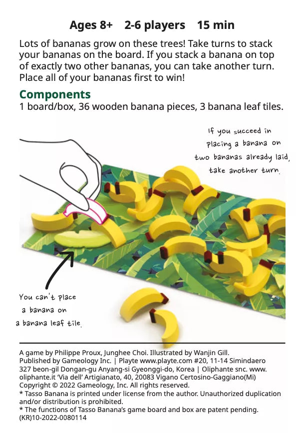 Lots of bananas grow on these trees! Take turns to stack your bananas on the board. If you stack a banana on top of exactly two other bananas, you can take another turn. Place all of your bananas first to win!