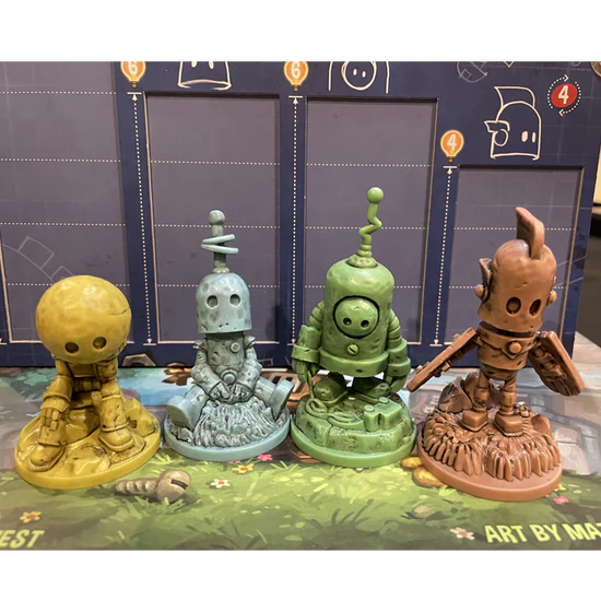 Based on the lovely illustrated world of Matt Dixon, Transmissions brings his world of mechanical friends to life. In the game, players share robots as workers moving around a rondel-styled board, collecting engrams and electricity. These are used to gather ideas to improve your use of the robots or items to score points at the end of the game. You also build your own set of connected, flowing pipes while gathering birds and butterflies to score even more points. The game ends when no ideas are left, a player's robots are complete, or no pipes remain to be built. After an equal number of turns, the player with the highest total score wins! The game features a unique mechanism of worker selection and sharing with incredible illustrations, adorable miniature robots, and very welcoming play for everyone!