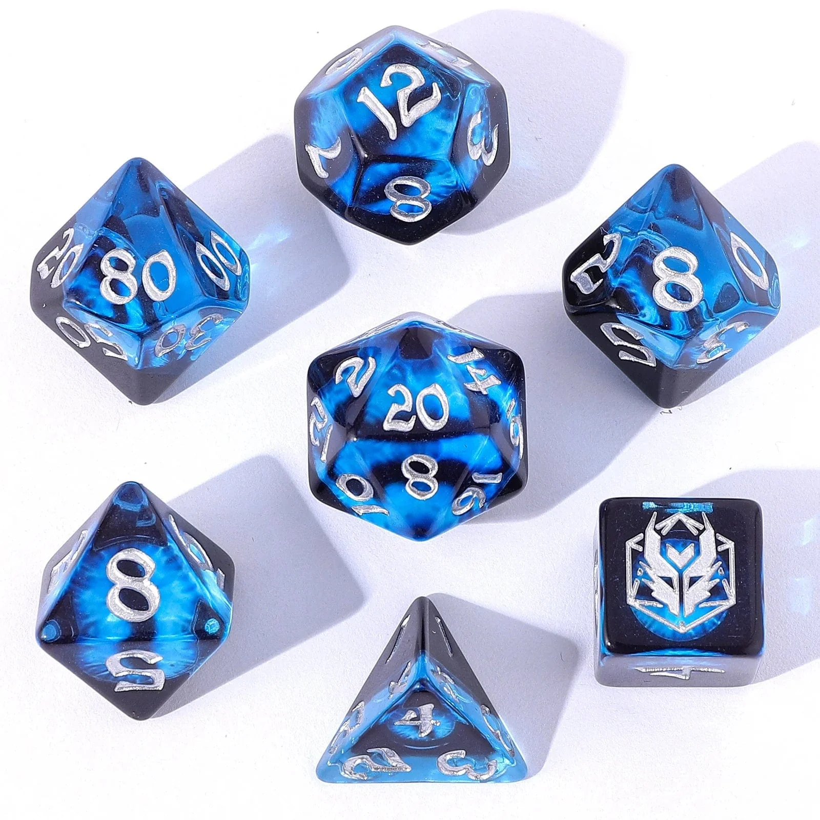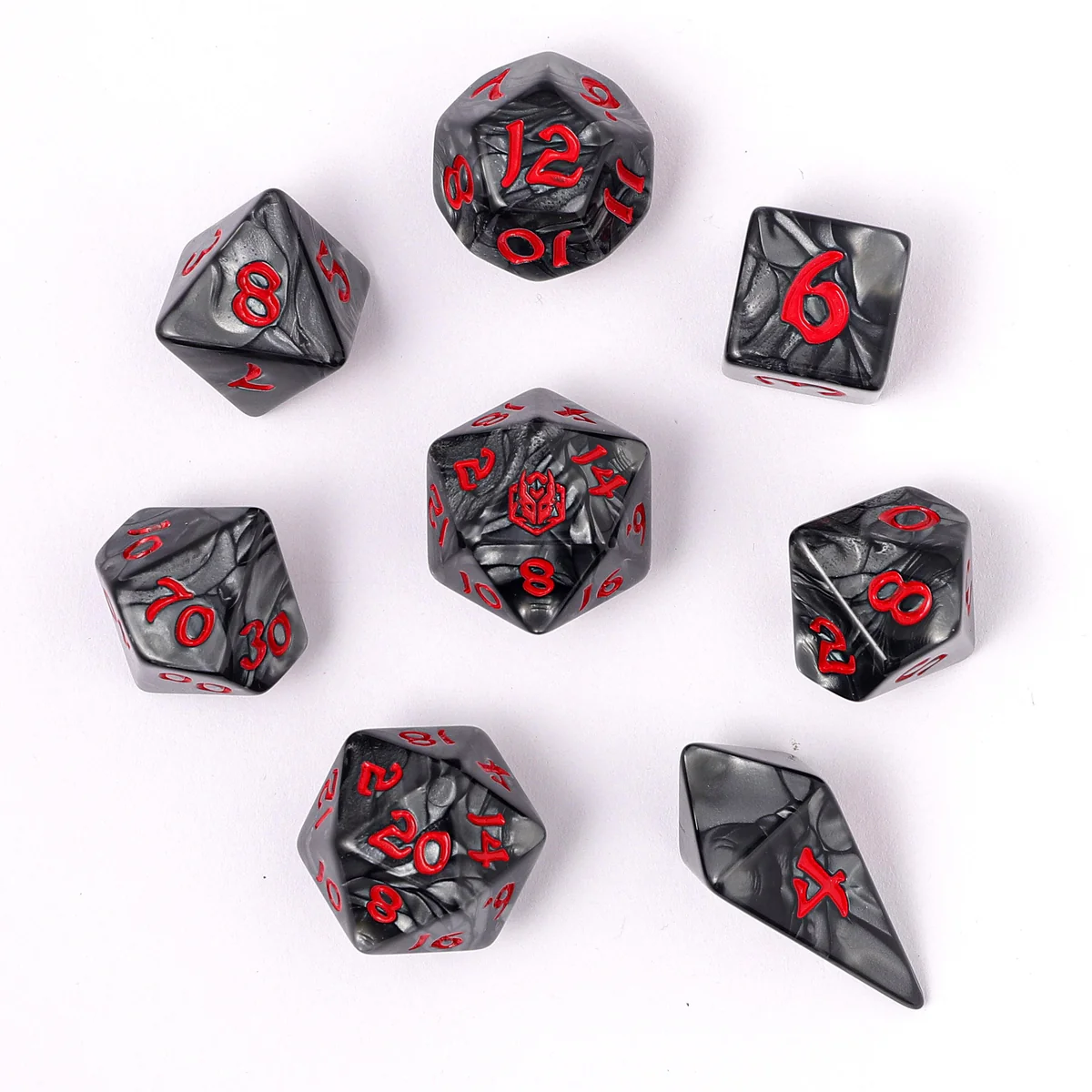 Hymgho's Wyrmforged Dice Sets are bold, premium tabletop dice designed to stand out at any game table. Each set features rounded edges, a slightly larger-than-standard size, and a distinctive configuration that includes a uniquely shaped d4, giving players extra flair and functionality during play.